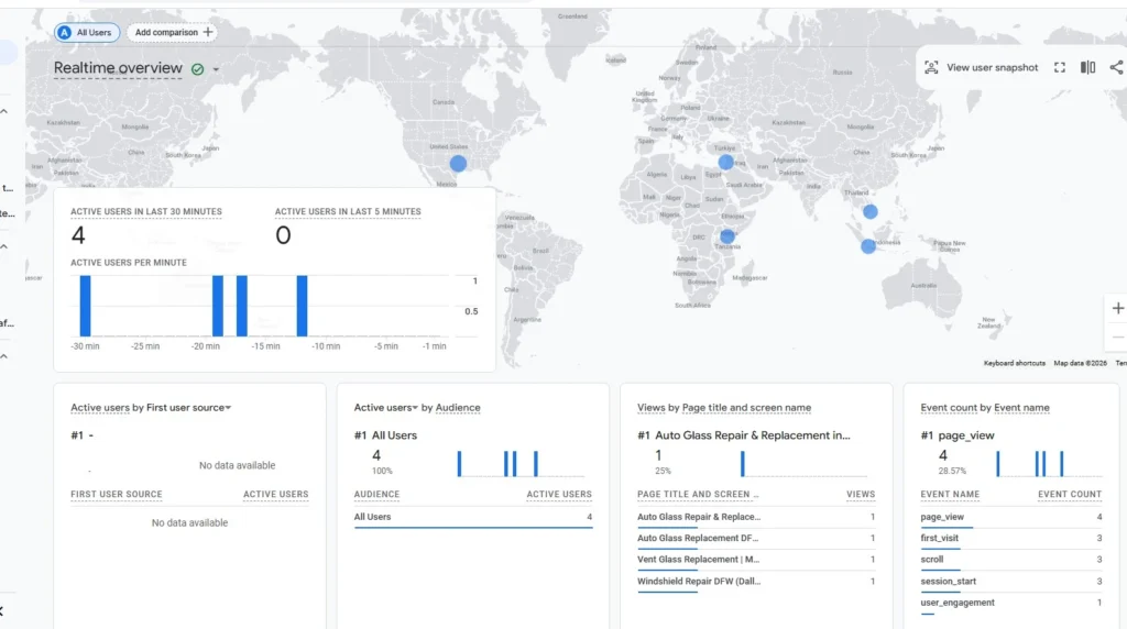 The specific metric to watch as an auto glass shop owner is phone number clicks on mobile that’s the action that leads directly to revenue. If you’re getting strong traffic but low phone clicks, your page layout or call-to-action needs attention. If phone clicks are high but call volume doesn’t match, your tracking number setup may need review.